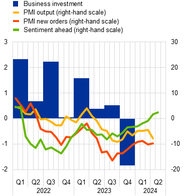 Notes: Lines indicate monthly developments, while bars refer to quarterly data. The PMIs are expressed in terms of the deviation from 50. In panel a), business investment is measured by non-construction investment excluding Irish intangibles. PMI lines refer to responses from the capital goods sector. ”Sentiment ahead” refers to the six-month ahead sub-index of the euro area Sentix Investor sentiment indicator (rescaled by a factor of three). The latest observations are for the fourth quarter of 2023 for business investment, May 2024 for the Sentix index and April 2024 for all other items. In panel b), the line for the European Commission’s activity trend indicator refers to the weighted average of the building and specialised construction sectors’ assessment of the trend in activity compared with the preceding three months, rescaled to have the same standard deviation as the PMI. The line for PMI output refers to housing activity. The latest observations are for the fourth quarter of 2023 for housing investment, and May 2024 for PMI output and the European Commission’s activity trend.