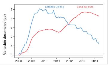 Desde comienzos de 2008 y hasta principios de 2011, ambas regiones muestran una trayectoria similar: las tasas de paro registran fuertes incrementos, seguidos de una estabilización y un descenso gradual. Esto refleja las raíces comunes de la perturbación: la sincronización del ciclo financiero entre las economías avanzadas, la contracción del comercio mundial tras la quiebra de Lehman Brothers, y una fuerte corrección de los precios de los activos, sobre todo inmobiliarios, en determinados países.