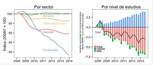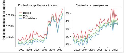 [ 4]Sobre la base de los índices de desajuste de cualificación calculados como la diferencia entre la demanda de cualificación (representada por el nivel de estudios de los empleados) y la oferta de cualificación (representada por nivel de estudios de la población activa o los desempleados, respectivamente). Véase «Comparisons and contrasts of the impact of the crisis on euro area labour markets», ECB Occasional Paper, pendiente de publicación.