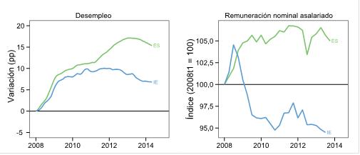 Esta evolución divergente puede explicarse en parte por las diferencias en la inmigración neta, aunque también se debe a que al inicio de la crisis Irlanda contaba con un mercado de trabajo relativamente flexible, y a que aplicó reformas laborales adicionales dentro de un programa de la UE y el FMI que entró en vigor en noviembre de 2010. Por su parte, en el momento de iniciarse la crisis, España presentaba fuertes rigideces en su mercado de trabajo y la reforma solo comenzó a aplicarse de manera significativa en 2012.