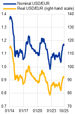 Notes: Panel a): The real USD/EUR refers to the CPI-deflated bilateral exchange rate (right-hand scale). An increase denotes an appreciation of the euro. Panel b): The real CNY/EUR refers to the CPI-deflated bilateral exchange rate (right-hand scale). An increase denotes an appreciation of the euro. Panel c): Nominal effective exchange rate and real (CPI-deflated) effective exchange rate, denominated in euro, for selected Asian trading partners (Japan, South Korea, Indonesia, India, Malaysia, Philippines, Taiwan and Thailand). Corresponding trade weights are normalised to one. EUR NEER refers to the nominal effective exchange rate of the euro and EUR REER refers to the real effective exchange rate of the euro, The latest observations are for October 2025.