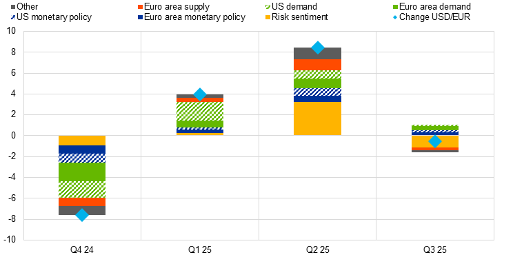 Chart 3 zooms in further by examining the evolution of the dollar-euro exchange rate over the last year (Q4 2024 through Q3 2025) in the context of a BVAR model maintained by ECB staff. A striking feature of this analysis is the contribution of risk sentiment to euro appreciation in Q2 2025, reflecting some mix of a decline in risk sentiment towards the dollar and an improvement in risk sentiment towards the euro.