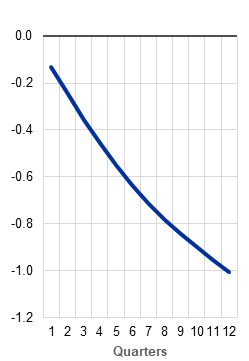 Model-based analysis allows for a broader analysis of the transmission of exchange rate changes on the key macroeconomic variable. Simulations based on the ECB’s semi-structural multi-country model indicate that a 10 per cent appreciation in the euro plays out over several years, with inflation markedly lower for about three years and a peak disinflation impulse of 0.6 percentage points after about a year.[8] The level of GDP declines throughout this adjustment period, with a cumulative loss of about one per cent of GDP after three years. In relation to trade dynamics, the euro appreciation reduces export volumes by about 3 per cent over this horizon and import volumes by about 1.5 per cent.