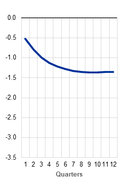 In the model, the transmission of the exchange rate shock operates primarily through the effects on trade deflators, which in turn influence export and import volumes. The appreciation makes euro area exports more expensive on international markets, reducing export volumes. At the same time, the appreciation also lowers the price of imports, dampening domestic inflationary pressures. Overall, imports decline despite the reduction in import prices as the demand drag dominates, with both private consumption and investment decreasing: consumption falls as economic activity contracts and labour demand slows. Investment declines as higher real interest rates and the appreciation’s disinflationary effects take hold. The resulting drop in the relative price of investment goods further suppresses investment, especially in externally exposed sectors.