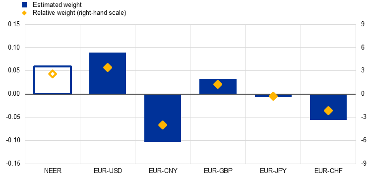 Notes: The chart shows the estimated weight of the euro nominal effective exchange rate (NEER) in the baseline specification of the Macro-Finance Financial Conditions Index (hollow bar) and its relative weight among the nine asset prices included (hollow diamond). The filled bars and diamonds refer to the estimates of an alternative specification in which the nominal effective exchange rate is replaced with five bilateral euro exchange rates.