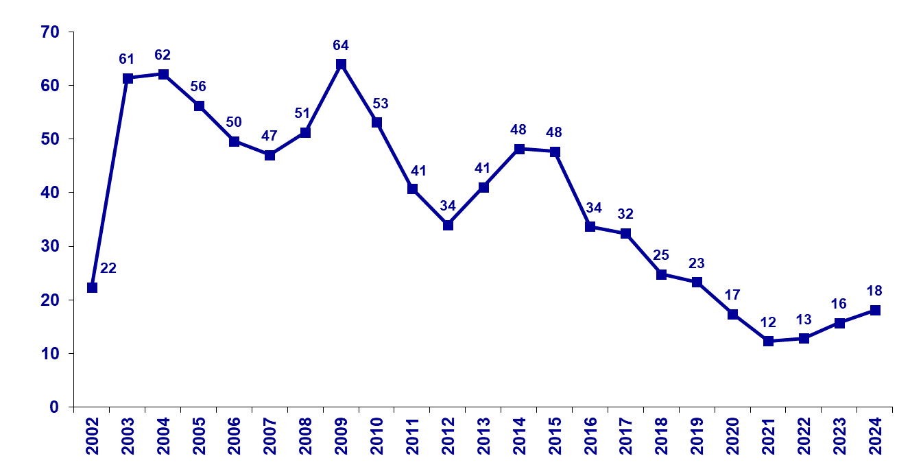 Runt 554 000 förfalskade eurosedlar togs ur omlopp under 2024. Risken för att få en förfalskning är liten eftersom antalet förfalskade sedlar är mycket lågt jämfört med antalet äkta eurosedlar i omlopp. Under 2024 upptäcktes 18 förfalskningar per miljon äkta sedlar i omlopp, vilket är mycket lågt jämfört med nivåerna efter införandet av euron (se diagram).