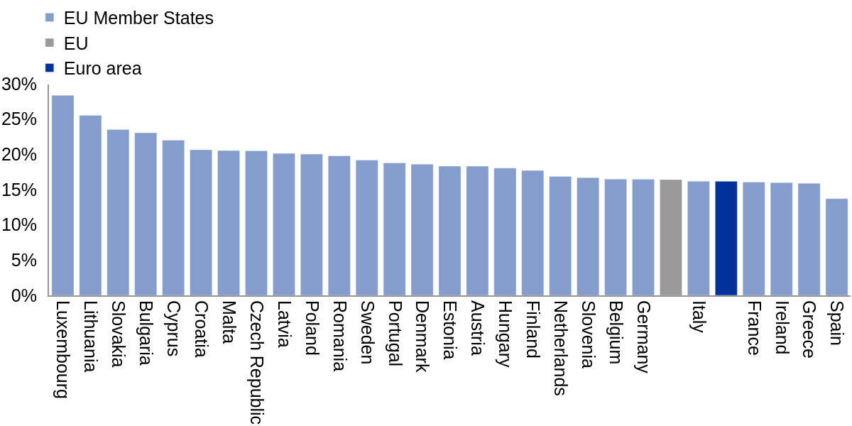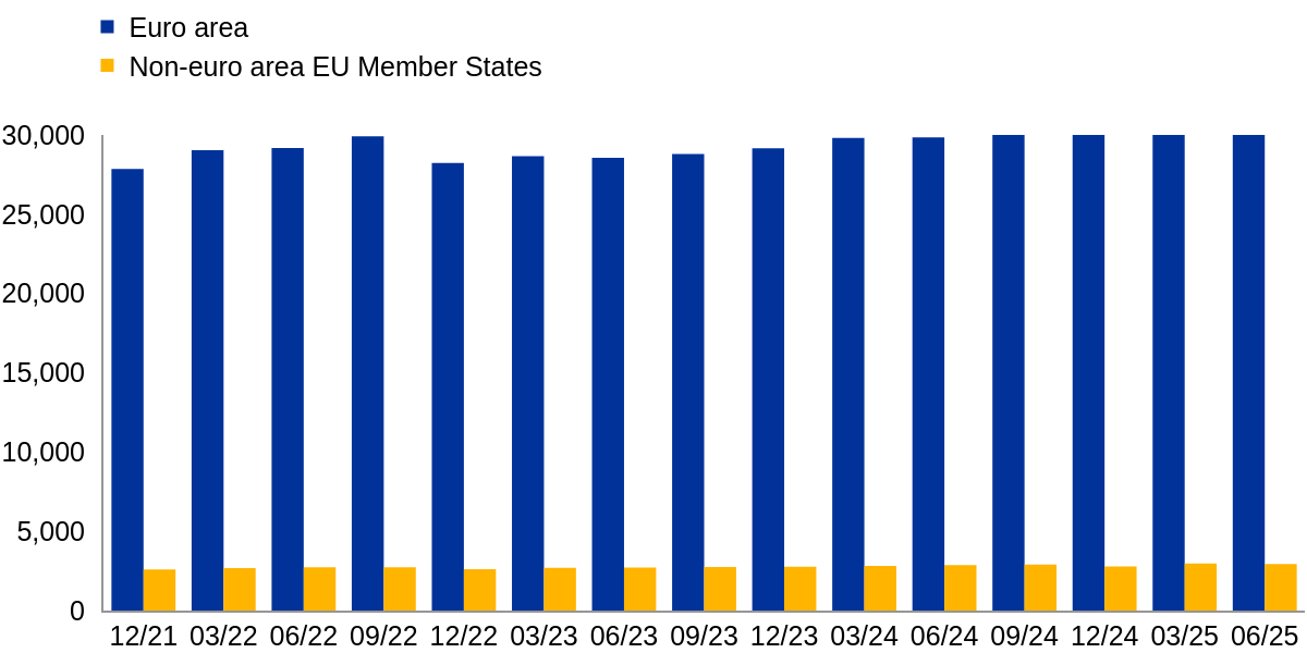 - The aggregate of total assets of EU-headquartered credit institutions increased by 1.75%, from €32.70 trillion in June 2024 to €33.27 trillion in June 2025