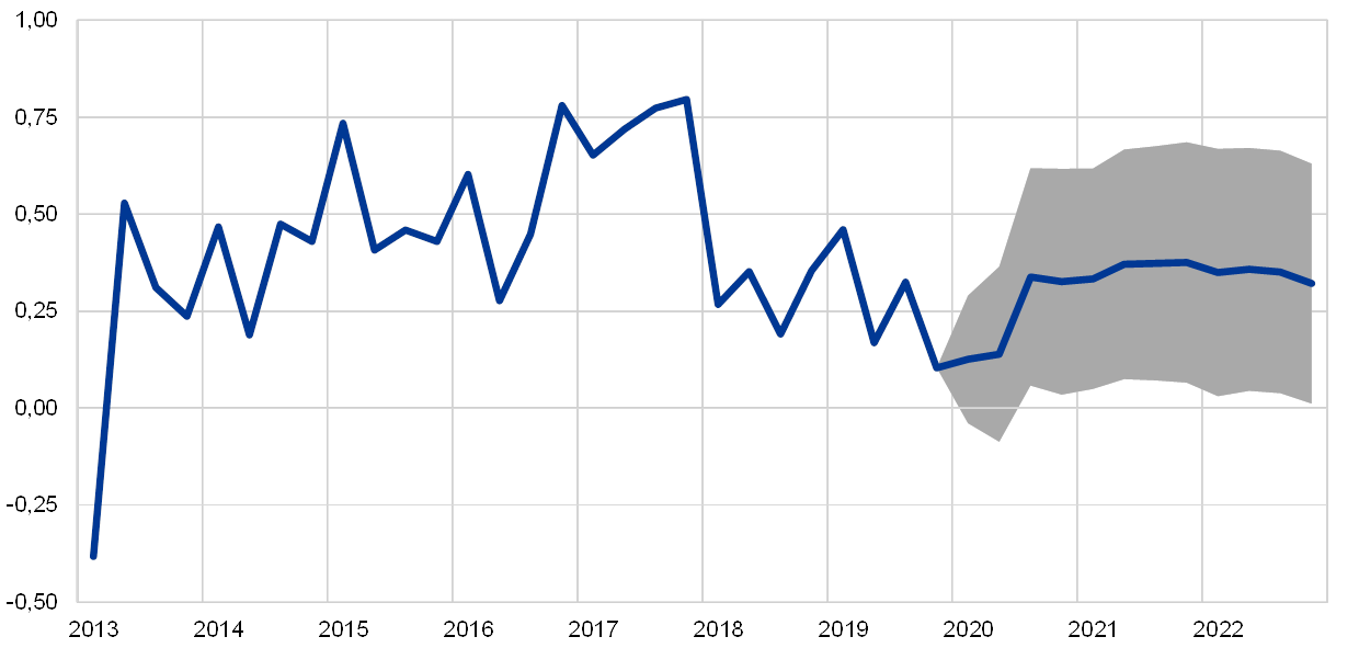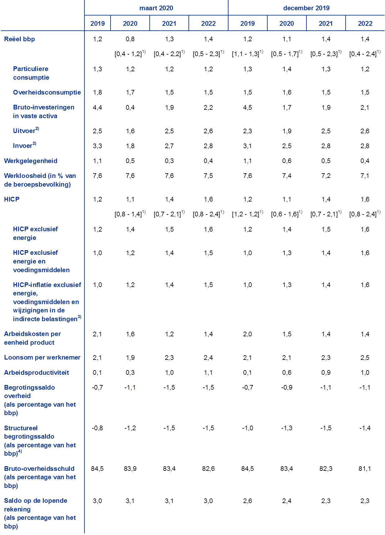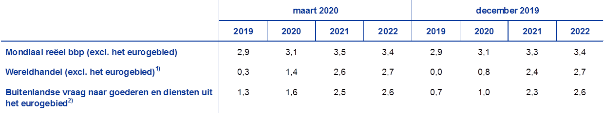 Vergeleken met de projecties van december 2019 is de reële bbp-groei voor 2020 met 0,3 procentpunt en voor 2021 met 0,1 procentpunt naar beneden bijgesteld. De neerwaartse bijstelling van de bedrijvigheid voor 2020 weerspiegelt een klein overloopeffect van de zwakker dan verwachte resultaten voor de groei in het vierde kwartaal van 2019, een langer aanhoudende zwakte in de verwerkende industrie dan eerder was voorzien en, vooral, de verwachte negatieve gevolgen van de uitbraak van Covid-19. De lagere groei in 2020 leidt tot enkele negatieve overloopeffecten in 2021.