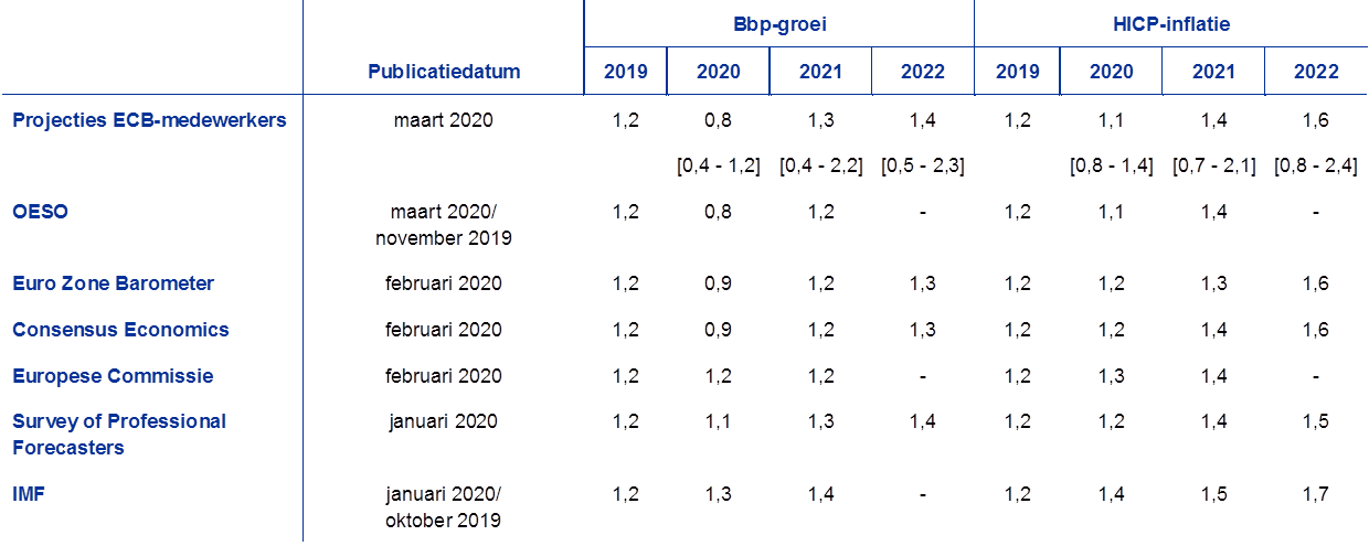 De door medewerkers opgestelde projecties voor de reële bbp-groei en de HICP-inflatie liggen grotendeels binnen de bandbreedte van de prognoses van andere instellingen en van voorspellers uit de private sector. De projecties voor groei en inflatie voor 2020 zijn lager dan die van andere voorspellers, met uitzondering van de OESO, de enige instelling die een update (voor de reële bbp-groei) heeft gepubliceerd na de uitbraak van Covid-19 in Italië (op 2 maart).