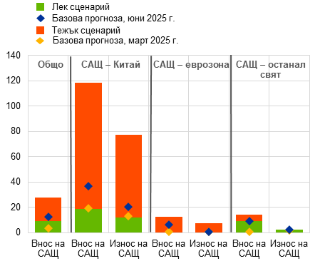 Забележки: В панел „а“ са представени претеглените средни на митническите ставки на равнище продукти, като са използвани търговските потоци през 2023 г. Зелените стълбчета отразяват лекия сценарий (Китай 10%, ЕС 0%, Канада и Мексико 25% за стоки, които не отговарят на изискванията от споразумението между тези две държави и САЩ, останал свят – 10%, секторни митнически тарифи за целия свят). Сините (съответно жълтите) ромбове показват нивото на митническите тарифи в базовата прогноза от юни 2025 г. (съответно март 2025 г.). Делтата на тежкия спрямо лекия сценарий е представена с червени стълбчета. За панел „б“ последните данни са за април 2025 г. В панел „б“ са представени претеглените средни на митническите ставки на равнище продукти за всеки сценарий, като са използвани търговските потоци през 2024 г.