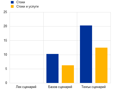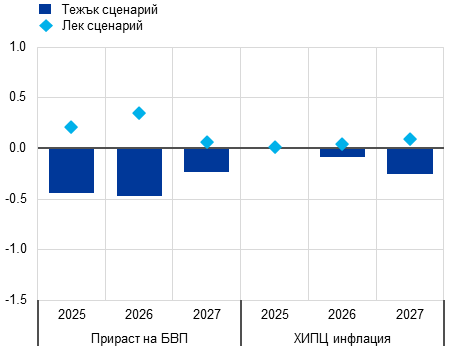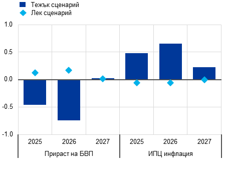 При тежкия сценарий в САЩ и Китай настъпват силни макроикономически последици. Прогнозира се по-високите мита да тласнат нагоре потребителските цени, като през периода 2025 – 2026 г. инфлацията нараства с около 0,5 процентни пункта (Графика Г, панел „а“). Не би се увеличил износът на САЩ към други държави, но леко би се увеличил вносът. По-голямата несигурност, свързана с търговските политики, би потиснала допълнително растежа. Прирастът на реалния БВП на САЩ би бил с около 0,7 процентни пункта по-нисък спрямо базовата прогноза през 2026 г. При тежкия сценарий Китай също би бил засегнат негативно. Налагането от САЩ на високи мита срещу Китай и ответните мерки биха намалили рязко двустранната търговия, но би се увеличил износът на Китай за други държави, включително еврозоната. Прирастът на реалния БВП на Китай би бил с 0,6 процентни пункта по-нисък през 2025 г. и с 0,3 процентни пункта по-нисък през 2026 г., а това би отслабило инфлацията през 2026 г. (Графика Г, панел „б“).