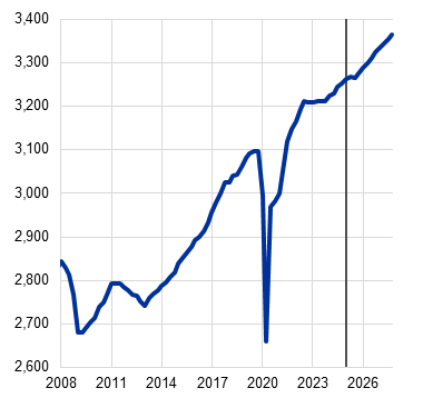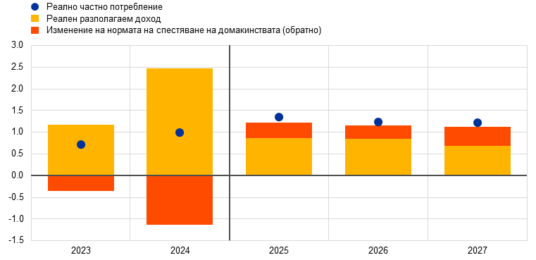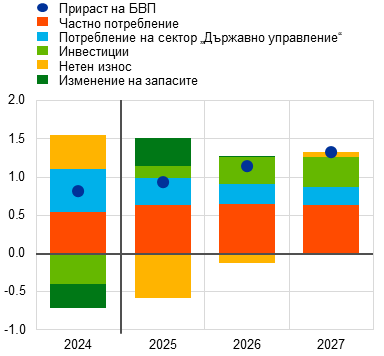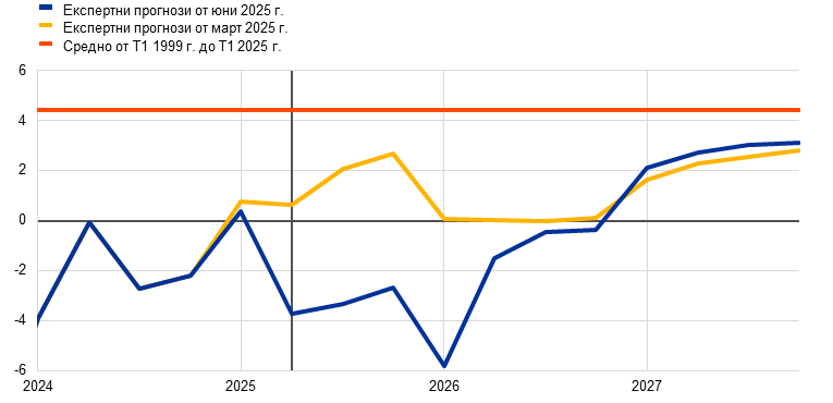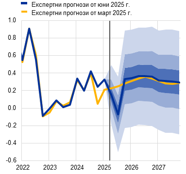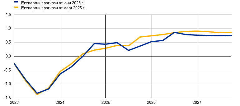 Перспективата за икономическия растеж на еврозоната е помрачена от напрежение в търговията и повишена несигурност в световен план. За 2025 г. като цяло се смята, че тези ефекти ще бъдат отчасти компенсирани от по-силна от очакваното икономическа активност през първото тримесечие, която вероятно отразява донякъде изтегляне напред на износ в очакване на по-високи митнически тарифи. В средносрочен план се очаква икономическата активност да бъде подпомогната от обявените наскоро нови фискални мерки. В базовата прогноза се допуска, че митата, наложени от САЩ върху стоките от ЕС, които бяха увеличени на 10%, ще останат в сила през целия прогнозен период. Наред с повишената несигурност, свързана с търговските политики, и неотдавнашното поскъпване на еврото по-високите мита ще възпрепятстват износа от еврозоната и инвестициите, както и – в по-малка степен – потреблението. За разлика от това новите държавни разходи за инфраструктура и отбрана, най-вече в Германия, би трябвало да стимулират вътрешното търсене в еврозоната от 2026 г. нататък. Като цяло се запазват условията за засилване на растежа на БВП на еврозоната в хода на прогнозния период. По-специално, нарастване на реалните заплати и заетостта, по-слабо рестриктивни условия за финансиране, отразяващи предимно последните решения по паричната политика, и възстановяване на външното търсене по-нататък през прогнозния период би трябвало да допринесат за постепенно възстановяване. Очаква се средният годишен прираст на реалния БВП да бъде 0,9% през 2025 г., 1,1% през 2026 г. и 1,3% през 2027 г. В сравнение с макроикономическите прогнози на експертите на ЕЦБ от март 2025 г. перспективата за прираста на БВП е неревизирана за 2025 г. в отражение на по-добри от очакваното постъпващи данни, за които се смята, че са в общи линии неутрализирани от ефектите от напрежението в търговията и от поскъпването на еврото. Напрежението в търговията и повишението на обменния курс доведоха до низходяща ревизия на растежа за 2026 г., а за 2027 г. той остава неревизиран.[1]