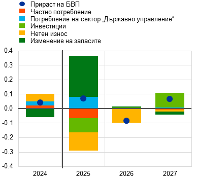 Допълнителен фактор за затягане през 2025 г. е по-нататъшното намаляване на оставащите мерки за енергийна подкрепа, докато потреблението на сектор „Държавно управление“ и държавните инвестиции продължават да растат и фискалните трансфери се увеличават. Разхлабването на недискреционните фактори се дължи на неизпълнение на приходите и други остатъчни данъчни фактори, а структурните ефекти, които бяха силно положителни през 2024 г., се очаква да бъдат неутрални както през 2025 г., така и през остатъка от прогнозния период.