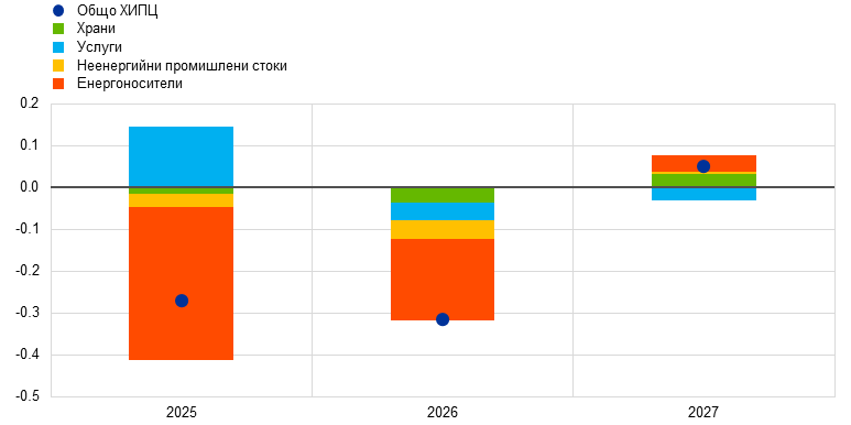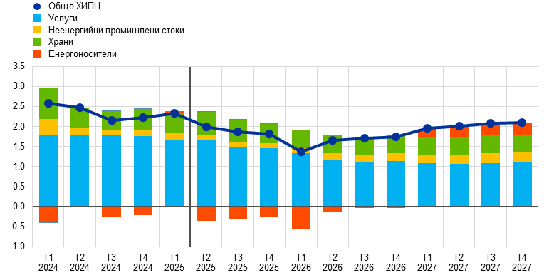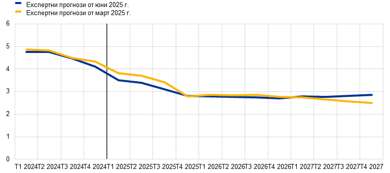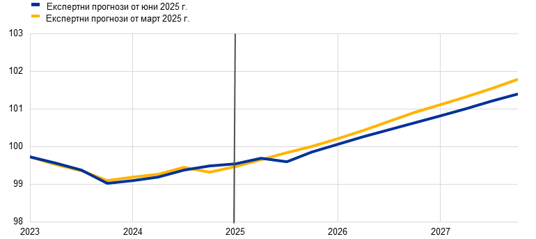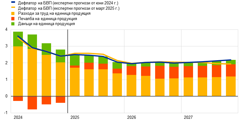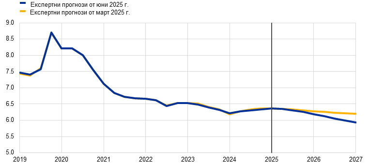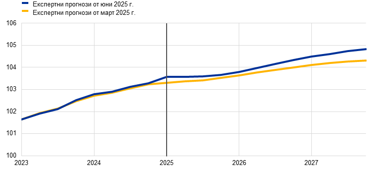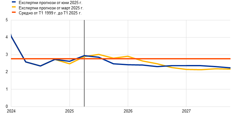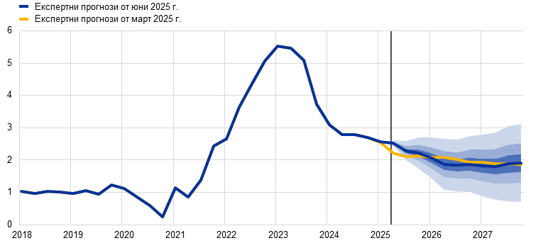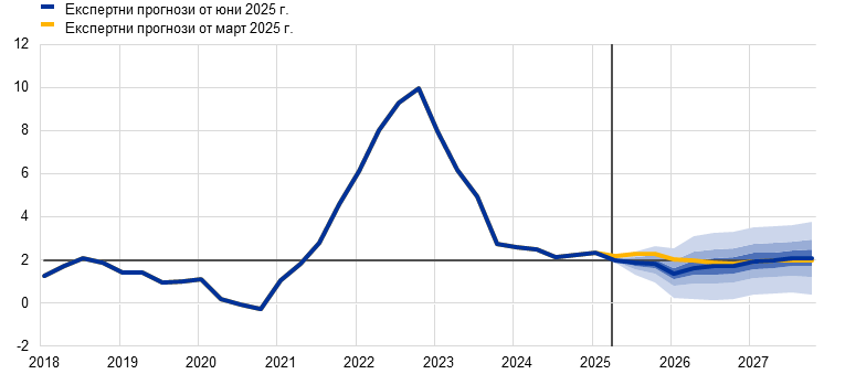 Макар да е вероятно общата инфлация, измерена чрез хармонизирания индекс на потребителските цени (ХИПЦ), да се задържи под 2% в краткосрочен план, очаква се в средносрочен тя да се върне към целевото равнище. Предвижда се, че в хода на 2025 г. инфлацията ще отслабва и ще достигне най-ниска стойност от 1,4% през първото тримесечие на 2026 г., след което през 2027 г. ще се върне до 2,0%. Смята се, че спадът на общата инфлация през 2025 г. е обусловен отчасти от отрицателната енергийна инфлация след неотдавнашното поевтиняване на петрола и спада на цените на едро на природния газ. Очаква се инфлацията на енергоносителите да остане отрицателна до 2027 г., когато влизат в сила нови мерки за смекчаване на изменението на климата в контекста на новата схема за търговия с емисии (СТЕ2). След временно увеличение през второто тримесечие на 2025 г. се очаква през 2027 г. инфлацията при храните да спадне до равнища малко над 2%. Предвижда се ХИПЦ инфлацията без компонентите енергоносители и храни да намалее благодарение на компонента на услугите с отзвучаването на ефектите от настъпващи със забавяне корекции на цените на някои от тях, отслабването на натиска от страна на заплатите и отразяването на по-ниските енергийни цени по веригата на ценообразуването. Би трябвало нарастването на заплатите да запази низходящия си тренд с отзвучаването на натиска за наваксване на предходни загуби на реална заплата. В съчетание с възстановяване на растежа на производителността това се очаква да доведе до значително по-бавно нарастване на разходите за труд на единица продукция. Външният ценови натиск, отразен в цените на вноса, се очаква да остане умерен при допускане за липса на промяна в митническата политика на ЕС, като известен низходящ натиск би произтекъл от по-високия обменен курс на еврото и от поевтиняването на енергийните суровини през последните месеци. В сравнение с прогнозите от март 2025 г. перспективата за общата ХИПЦ инфлация е ревизирана надолу с 0,3 процентни пункта както за 2025 г., така и за 2026 г. поради допускането за по-ниски цени на енергийните суровини и поскъпването на еврото. За 2027 г. стойността не е ревизирана.