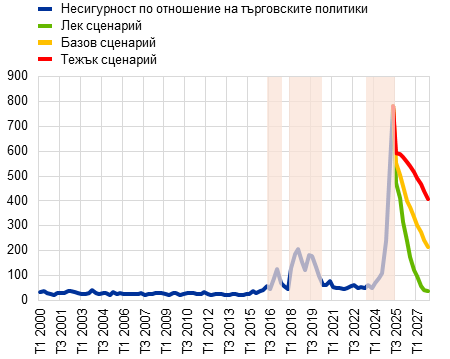 В базовия сценарий се допуска, че наложените от САЩ мита върху вноса на стоки са по-високи в сравнение с прогнозите от март 2025 г. Приема се, че всички прекъсвания на прилагането на митата към момента на завършване на прогнозите ще продължат. Митата на САЩ върху вноса на стоки се увеличават от близо до нула с 10 процентни пункта за всички държави – с изключение на Китай, където увеличението е с около 20 процентни пункта до ефективна ставка от около 40% (ако се смятат и стоките, и услугите). Освен това се допуска, че ЕС не предприема ответни мерки, а мерките на Китай са симетрични (Графика A, панел „а“).[3] Очаква се несигурността във връзка с търговските политики да остане висока през целия прогнозен период, но до края на 2027 г. да спадне до нивото от 2018 г. (Графика Б, панел „a“).