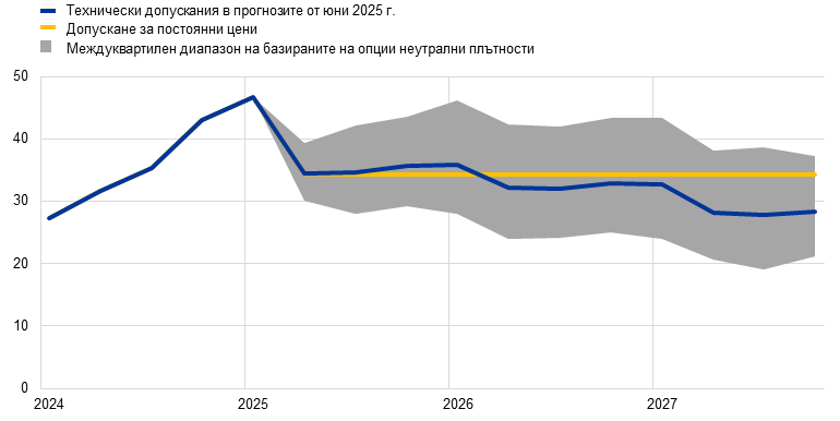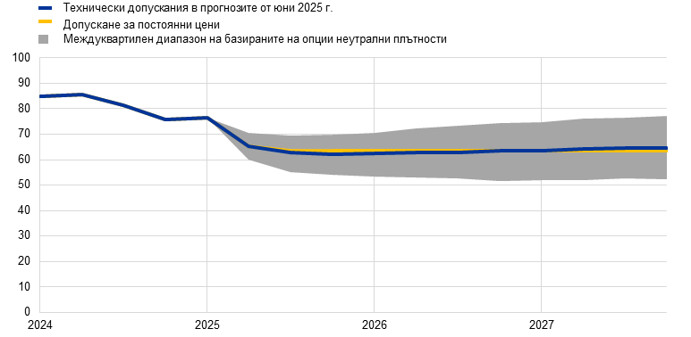 Забележки: Ревизиите са изразени като проценти за равнищата, процентни пунктове за темпа на прираст и проценти на годишна база. Ревизиите на темповете на растеж и лихвените проценти се изчисляват по стойности, закръглени до първия знак след десетичната запетая. Ревизиите, отчетени като процентни изменения, са изчислени въз основа на незакръглени стойности. Техническите допускания за лихвените проценти и за цените на суровините в еврозоната се основават на пазарните очаквания към 14 май 2025 г. (крайна дата). Цените на петрола се отнасят до спот цените и фючърсните цени на суровия петрол тип „Брент“. Цените на природния газ се отнасят до спот цените и фючърсните цени на природния газ на нидерландската борса TTF. Цените на електроенергията се отнасят до средната спот и фючърсна цена на едро в петте най-големи държави в еврозоната. „Синтетичната“ фючърсна цена на квотите по СТЕ1 се изчислява като линейно интерполирана стойност в края на месеца на двете най-близки фючърсни цени за квоти по схемата на ЕС за търговия с емисии на Европейската енергийна борса. След това месечните фючърсни цени на квотите по схемата на ЕС за търговия с емисии се осредняват, за да се получи еквивалентна стойност на годишна честота. При отсъствието на търговия с квоти по СТЕ2 допусканията за цените бяха определени от експертите на нивото на праговата цена, над която ще бъдат освободени допълнителни квоти, а цената ще бъде актуализирана с цените за 2027 г. (за повече подробности вижте карето „Оценка на въздействието върху растежа и инфлацията от политиките за преход във връзка с изменението на климата“ в прогнозите на експертите на Евросистемата от декември 2024 г.). Тенденциите при цените на суровините са изведени от фючърсните пазари в периода от десет работни дни, завършващ на крайната дата. Приема се, че двустранните обменни курсове ще останат непроменени през прогнозния период – на средните равнища от периода от десет работни дни, завършващ на крайната дата. Допусканията за номиналната доходност на десетгодишните държавни облигации в еврозоната се основават на средната доходност на десетгодишните облигации на държавите, претеглена спрямо годишните стойности за БВП. При наличие на необходимите данни специфичната за отделна държава номинална доходност на десетгодишните държавни облигации се определя като доходността от десетгодишните референтни облигации, продължена посредством форуърдната номинална доходност, извлечена на крайната дата от съответните криви на доходността за конкретната държава. В останалите случаи специфичната за отделна държава доходност на десетгодишните държавни облигации се определя като доходността от десетгодишните референтни облигации, продължена посредством постоянен спред (отчетен на крайната дата) спрямо техническото допускане за безрисковите дългосрочни лихвени проценти в еврозоната.