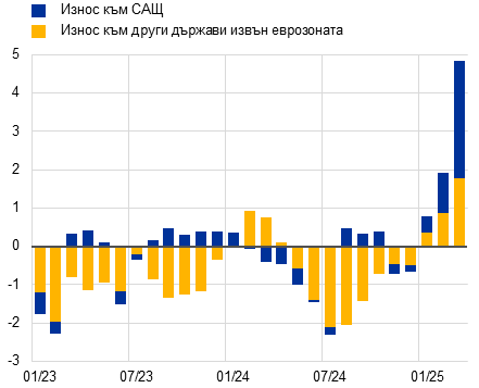Забележки: За панел „а“ последните данни са за април 2025 г. За панел „б“ базовите данни са сезонно изгладени. Тъй като данните за обема на износа от еврозоната за март 2025 г. не бяха налични към крайната дата, последните данни са изчислени приблизително чрез дефлиране на стойностите за март с износните цени на промишлените стоки. Последните данни са за март 2025 г.