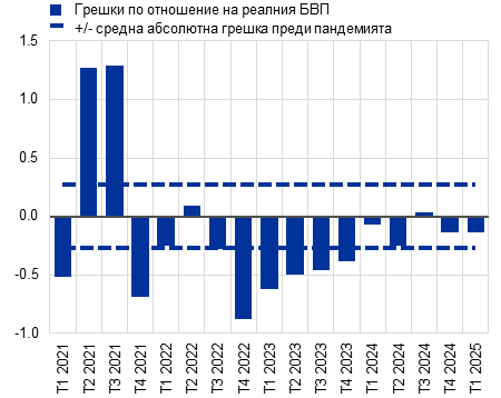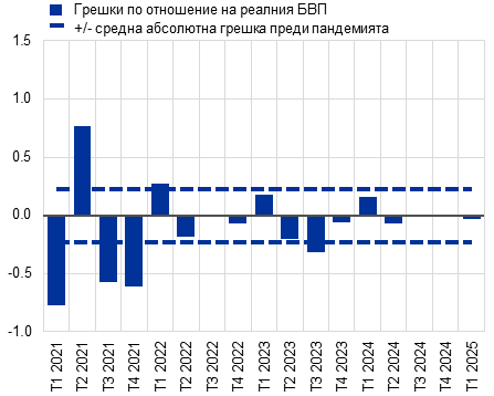 Забележки: Грешките се дефинират като действителен резултат за дадено тримесечие минус прогнозата, направена четири тримесечия по-рано (например резултатът в реално време за четвъртото тримесечие на 2022 г. минус прогнозата от макроикономическите прогнози на експертите на Евросистемата от декември 2021 г.).