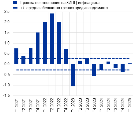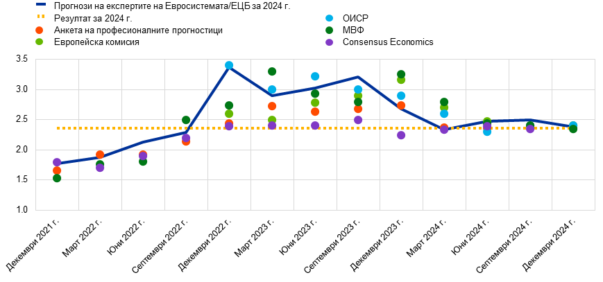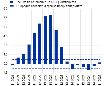 Вижте An update on the accuracy of recent Eurosystem/ECB staff projections for short-term inflation („Актуална информация относно точността на последните прогнози на експертите на Евросистемата/ЕЦБ за краткосрочната инфлация“), Икономически бюлетин, брой 2, ЕЦБ, 2024 г.; An updated assessment of short-term inflation projections by Eurosystem and ECB staff („Актуализирана оценка на краткосрочните инфлационни прогнози на експертите на Евросистемата и ЕЦБ“), Икономически бюлетин, брой 1, ЕЦБ, 2023 г.; и What explains recent errors in the inflation projections of Eurosystem and ECB staff? („Какво обяснява скорошните грешки в прогнозите на експертите на Евросистемата и ЕЦБ за инфлацията“), Икономически бюлетин, брой 3, ЕЦБ, 2022 г. Вижте също The empirical performance of ECB/Eurosystem staff inflation projections from 2000 („Емпирични показатели за прогнозите за инфлацията на експертите на ЕЦБ/Евросистемата от 2000 г.“), Икономически бюлетин, брой 5, ЕЦБ, 2024 г.