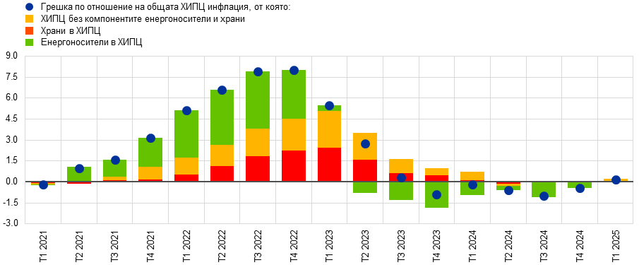 Завишените прогнозни стойности за инфлацията през последната година се дължат почти изцяло на волатилния компонент на енергоносителите, докато основната инфлация беше забележително точна (Графика В). След руската инвазия в Украйна цените на природния газ скочиха внезапно и доведоха до съществени грешки в прогнозите за инфлацията на енергоносителите. Грешките в инфлацията на храните в ХИПЦ и в ХИПЦ инфлацията без компонентите енергоносители и храни също се увеличиха с течение на времето, тъй като предприятията пренасяха натиска от страна на разходите на по-широка основа и по-често, а инфлацията при услугите стана по-трайна поради засиленото търсене след пандемията. От 2023 г. грешките в прогнозите за всички компоненти постепенно намаляха. Грешките в прогнозите за една година напред станаха отрицателни от четвъртото тримесечие на 2023 г. насам. Причината за това са грешките при инфлацията на енергоносителите, дължащи се до голяма степен на факта, че цените на едро на природния газ бяха по-ниски от заложените в цените на фючърсите. Компонентите храни и основна инфлация бяха в пълно съответствие с прогнозите от юни 2024 г. насам.