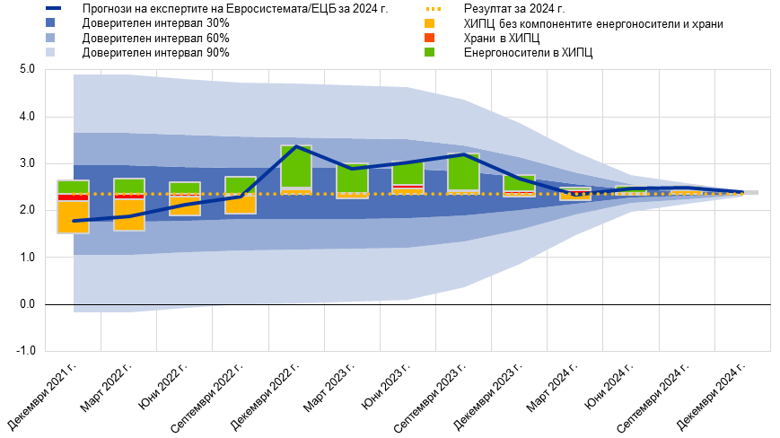 Забележки: Датите се отнасят за публикуването на всяка прогноза. Синята линия показва прогнозата на експертите на Евросистемата/ЕЦБ за годишната инфлация през 2024 г. във всяко издание. Стълбчетата представят разбивка на грешката при прогнозата по инфлационен компонент. Защрихованите области показват доверителен интервал от 30%, 60% и 90% въз основа на предишни грешки в прогнозите за инфлацията, с фокус върху крайния резултат за инфлацията през 2024 г., както те биха били оценени към момента на изготвянето на оценката. За информация относно методологията вижте карето „Представяне на несигурността, свързана с прогнозите“ в макроикономическите прогнози на експертите на ЕЦБ за еврозоната от март 2023 г.