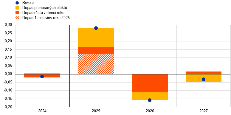 Poznámky: Svislá čára označuje začátek horizontu projekcí. Revize vycházejí z nezaokrouhlených hodnot. Červeně šrafovaná část sloupce znázorňuje dopad výsledků za první a druhé čtvrtletí roku 2025 na růst během roku 2025.
