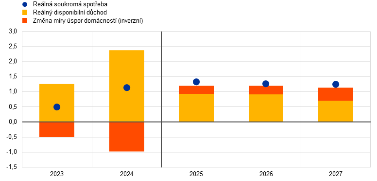 Růst reálného HDP by měl být i nadále tažen soukromou spotřebou. Z pohledu výdajů (graf 2 –, panel a) by soukromá spotřeba měla po celý horizont projekcí výrazně růst a poskytovat tak největší příspěvek k růstu reálného HDP. Navíc by se měla v letech 2025–2027 každoročně zvyšovat vládní spotřeba a celkové investice, přičemž soukromé investice by měly v roce 2027 vyrovnat očekávaný silný propad veřejných investic vyplývající z ukončení platnosti grantového financování v rámci NGEU. Naopak se předpokládá, že příspěvek čistého vývozu k růstu reálného HDP bude v letech 2025 a 2026 záporný – s přispěním dovozu (−1,2 procentního bodu, resp. −0,9 procentního bodu) předstihujícím vývoz (0,6 procentního bodu, resp. 0,5 procentního bodu) – to je však částečně vyrovnáno kladným příspěvkem změny stavu zásob v roce 2025 (graf 2, panel b). Vysoce volatilní změny zásob v roce 2025 souvisejí s budováním a snižováním zásob v souvislosti s vlivy předzásobení a jejich odezníváním.