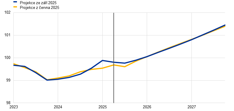 Výhled inflace odpovídá tomu, že se inflace stabilizuje poblíž 2% střednědobého cíle. Celková inflace, měřená harmonizovaným indexem spotřebitelských cen (HICP), by měla po zbytek roku 2025 kolísat poblíž 2 %, v roce 2026 klesnout na 1,7 % a následně se v roce 2027 zotavit na úroveň 1,9 %. Pokles v roce 2026 odráží další postupné snižování cen neenergetických složek, zatímco růst cen energií by měl zůstat volatilní, ale v horizontu projekcí by měl zesílit, částečně v důsledku spuštění systému EU pro obchodování s emisemi ETS2 v roce 2027. Očekává se, že ceny potravin zpočátku i nadále porostou rychleji, neboť se projeví zpožděné dopady dřívějšího růstu cen mezinárodních potravinářských komodit. V letech 2026 a 2027 by však růst měl zmírnit na úroveň mírně nad 2 %. Inflace měřená HICP bez započtení energií a potravin (HICPX) by měla klesat s tím, jak poleví mzdové tlaky a zmírní se růst cen služeb a jak se posilování eura projeví v cenovém řetězci a omezí růst cen zboží. Očekává se, že nižší růst mezd vyplývající z již realizované kompenzace ztrát reálných mezd v minulosti a oživení růstu produktivity povedou k výrazně pomalejšímu růstu jednotkových mzdových nákladů. V porovnání s projekcemi z června 2025 byl výhled celkové inflace měřené HICP revidován pro rok 2025 i 2026 o 0,1 procentního bodu směrem nahoru. Důvodem jsou vyšší aktuální údaje o cenách energetických komodit i předpoklady o jejich budoucím vývoji a také zpožděné účinky vyšších mezinárodních cen potravinářských komodit, které převažují nad posílením eura. Očekává se, že v roce 2027 budou převládat zpožděné účinky posilování eura, což povede k revizi o 0,1 procentního bodu směrem dolů.