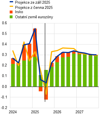 Obchodní cla a související nejistota přispěly během první poloviny roku 2025 k výrazným výkyvům hospodářské aktivity a jejímu uspíšení, zejména v Irsku. Odeznívání těchto faktorů ve druhé polovině roku by mělo přinést další volatilitu, která znesnadňuje interpretaci signálů o základní dynamice hospodářství eurozóny. Odhlédneme-li od volatility způsobené výkyvy údajů o Irsku, hospodářský růst ve zbytku eurozóny byl stabilnější a očekává se, že tomu tak bude i ve druhé polovině roku. I když nová obchodní dohoda mezi USA a EU přináší vyšší cla na vývoz z eurozóny do Spojených států, pomohla snížit nejistotu v oblasti obchodní politiky. Později ve sledovaném období by měl hospodářský růst v eurozóně za podpory několika faktorů posilovat. Rostoucí reálné mzdy a zaměstnanost spolu s novými vládními výdaji na infrastrukturu a obranu (zejména v Německu) by měly posílit domácí poptávku v eurozóně. Dále se předpokládá, že výhled hospodářského růstu podpoří také méně restriktivní podmínky financování, které odrážejí především nedávná měnová rozhodnutí, a oživení zahraniční poptávky v roce 2027. Průměrné meziroční tempo růstu reálného HDP by mělo dosáhnout úrovně 1,2 % v roce 2025, 1,0 % v roce 2026 a 1,3 % v roce 2027. V porovnání s makroekonomickými projekcemi odborníků Eurosystému z června 2025 byl výhled růstu HDP pro rok 2025 revidován o 0,3 procentního bodu směrem nahoru, což odráží lepší aktuální údaje, než se očekávalo, a přenosový efekt revizí údajů za minulá období. Vzhledem k tomu, že ne všechna překvapivá data se týkají výraznějšího uspíšení hospodářské aktivity oproti předpokladům, očekává se, že ve druhé polovině roku budou kompenzována pouze částečně. Posílení eura a slabší zahraniční poptávka (částečně související s poněkud vyššími cly oproti předpokladům v červnových projekcích) vedly pro rok 2026 k revizi o 0,1 procentního bodu směrem dolů. Projekce pro rok 2027 zůstává beze změny.[1]