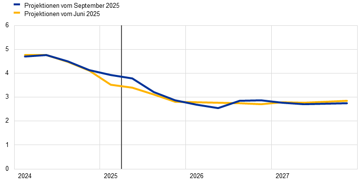 Die Inflationsaussichten stehen mit einer Stabilisierung der Inflation in der Nähe des mittelfristigen Ziels von 2 % im Einklang. Die am Harmonisierten Verbraucherpreisindex (HVPI) gemessene Gesamtinflation dürfte den Projektionen zufolge im weiteren Jahresverlauf 2025 bei rund 2 % verharren, bevor sie 2026 auf 1,7 % zurückgeht und 2027 wieder auf 1,9 % ansteigt. Der Rückgang im Jahr 2026 spiegelt eine weitere allmähliche Abschwächung der Nicht-Energie-Komponenten wider, während die Energiepreise den Erwartungen zufolge volatil bleiben werden. Sie dürften über den Projektionszeitraum hinweg jedoch ansteigen, unter anderem wegen der Einführung des EU-Emissionshandelssystems 2 (EU-EHS 2) im Jahr 2027. Die Teuerung bei Nahrungsmitteln dürfte zunächst erhöht bleiben, da sich die vergangenen Anstiege der internationalen Nahrungsmittelrohstoffpreise mit Verzögerung auswirken. In den Jahren 2026 und 2027 dürfte die betreffenden Raten jedoch auf Werte von etwas über 2 % zurückgehen. Die HVPI-Inflation ohne Energie und Nahrungsmittel (HVPIX) dürfte sinken. Dies ist auf nachlassenden Lohndruck und eine rückläufige Teuerung bei Dienstleistungen zurückzuführen. Ein weiterer Grund ist die Aufwertung des Euro, die auf die Preissetzungskette durchwirkt und die Teuerung bei Waren dämpft. Das geringere Lohnwachstum – zurückliegende Reallohnverluste wurden wettgemacht – dürfte zusammen mit einer Erholung des Produktivitätswachstums zu einem deutlich langsameren Anstieg der Lohnstückkosten führen. Im Vergleich zu den Projektionen vom Juni 2025 wurden die Aussichten für die HVPI-Gesamtinflation für 2025 und 2026 um jeweils 0,1 Prozentpunkte nach oben revidiert. Gründe hierfür sind höhere tatsächliche und angenommene Werte für die Energierohstoffpreise sowie verzögerte Auswirkungen der höheren internationalen Nahrungsmittelrohstoffpreise, die die Aufwertung des Euro mehr als ausglichen. Für das Jahr 2027 werden die verzögerten Auswirkungen der Euro-Aufwertung als vorherrschend betrachtet, was zu einer Abwärtskorrektur um 0,1 Prozentpunkte führt.