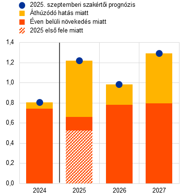 Megjegyzés: A függőleges vonal jelzi az előrejelzési időszak kezdetét. A módosítások kerekítetlen adatokon alapulnak. A csíkos, piros oszlop a 2025. első és második negyedévi eredményeknek az éven belüli növekedésre gyakorolt hatását mutatja.