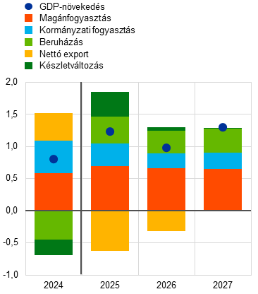 A reál-GDP növekedését várhatóan változatlanul a magánfogyasztás fogja ösztönözni. Kiadási szempontból [2. ábra, b) panel] a magánszektor fogyasztása a prognózis szerint az előrejelzési időszakban erőteljesen nő, és a legnagyobb mértékben járul hozzá a reál-GDP-növekedéshez. Emellett az állami fogyasztás és az összberuházás 2025-től 2027-ig várhatóan minden évben növekedni fog, és a magánberuházások ellensúlyozni fogják a közberuházásokban az NGEU keretében nyújtott támogatás megszűnéséből eredő, 2027-ben várható erős hirtelen kilengést. Ezzel szemben a nettó export a prognózis szerint 2025-ben és 2026-ban negatívan járul hozzá a reál-GDP-növekedéshez – az import hozzájárulása (−1,2 százalékpont, illetve −0,9 százalékpont) meghaladja az exportét (0,6 százalékpont, illetve 0,5 százalékpont) –, ezt azonban részben ellensúlyozni tudja a 2025-ös készletváltozások pozitív hozzájárulása [2. ábra, b) panel]. A készletek 2025 folyamán bekövetkező rendkívül volatilis változásai az előreütemezés hatásaival és azok lecsengésével összefüggő készletfelhalmozáshoz és készletcsökkenéshez köthetők.
