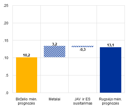 Nors nuo galutinės duomenų pateikimo 2025 m. birželio mėn. prognozėms rengti datos JAV muitai toliau didėjo, paskelbus preliminarius susitarimus dėl prekybos sandorių ir pratęsus paliaubas JAV ir Kinijos muitų kare, prekybos politikos neapibrėžtumas sumažėjo, nors ir tebėra didelis. Pagrindinio scenarijaus prielaidos dėl muitų ir prekybos politikos neapibrėžtumo išsamiau aptartos 1 intarpe. JAV administracija dar tęsia tyrimus pagal 232 skirsnį dėl vaistinių preparatų, puslaidininkių ir medienos, taigi tebėra rizikos, kad muitai gali būti didesni, negu numatoma.