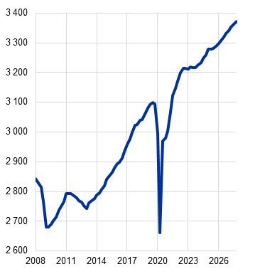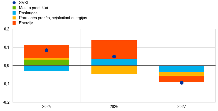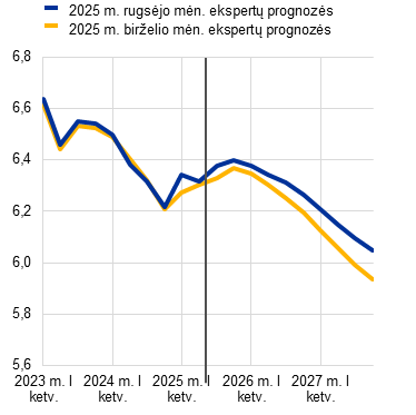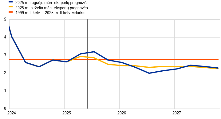 Infliacijos perspektyva atitinka infliacijos stabilizavimosi ties vidutinio laikotarpio tiksliniu 2 % lygiu prognozę. Numatoma, kad bendroji infliacija, vertinama pagal suderintą vartotojų kainų indeksą (SVKI), artimiausiu laikotarpiu iš esmės nesikeis ir kitą 2025 m. dalį bus apie 2 %, bet 2026 m. sumažės iki 1,7 %, o 2027 m. vėl padidės iki 1,9 %. Sumažėjimas 2026 m. susijęs su toliau laipsniškai švelnėjančiomis ne energetikos dedamosiomis, o energijos kainų kilimas turėtų toliau būti nepastovus, bet prognozių laikotarpiu padidėti iš dalies dėl to, kad 2027 m. pradės veikti naujoji ES apyvartinių taršos leidimų prekybos sistema (ATLPS2). Numatoma, kad iš pradžių maisto produktų kainos toliau kils dėl uždelsto anksčiau kilusių tarptautinių maisto žaliavų kainų poveikio, bet 2026 ir 2027 m. kilimas sumažės ir bus šiek tiek didesnis nei 2 %. Infliacija pagal SVKI, neįskaitant energijos ir maisto produktų, turėtų sumažėti, nes slopsta spaudimas darbo užmokesčiui ir lėtėja paslaugų kainų kilimas, o euro pabrangimas veikia kainų nustatymo grandinę ir varžo prekių kainų kilimą. Numatoma, kad, lėčiau kylant darbo užmokesčiui, nes jau kompensuotas ankstesnis realiojo darbo užmokesčio mažėjimas, ir kartu atsigaunant našumui, gerokai lėčiau didės vienetinės darbo sąnaudos. Palyginti su 2025 m. birželio mėn. prognozėmis, bendrosios infliacijos pagal SVKI prognozė 2025 ir 2026 m. padidinta 0,1 procentinio punkto dėl didesnių numatomų energijos žaliavų kainų bei prielaidų, taip pat dėl uždelsto didesnių tarptautinių maisto žaliavų kainų poveikio, kuris su kaupu atsveria euro pabrangimą. Numatoma, kad visus 2027 m. bus juntamas uždelstas euro pabrangimo poveikis, todėl tų metų prognozė sumažinta 0,1 procentinio punkto.