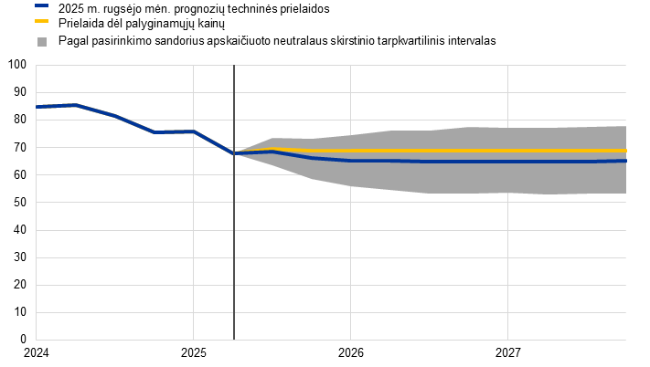 Pastabos: lygių korekcijos išreikštos procentais, o augimo tempų – procentiniais punktais ir procentais per metus. Augimo tempų ir palūkanų normų korekcijos apskaičiuotos remiantis vienos dešimtosios tikslumu suapvalintais skaičiais, o procentais išreikštos korekcijos apskaičiuotos remiantis nesuapvalintais skaičiais. Techninės prielaidos dėl euro zonos palūkanų normų ir žaliavų kainų grindžiamos rinkos lūkesčiais (galutinė duomenų įtraukimo data – 2025 m. rugpjūčio 15 d.). Naftos kainos – tai „Brent“ žalios naftos neatidėliotinų sandorių ir ateities sandorių kainos. Dujų kainos – tai Nyderlandų TTF dujų neatidėliotinų sandorių ir ateities sandorių kainos. Elektros energijos kainos – tai penkių didžiausių euro zonos šalių vidutinės didmeninės neatidėliotinų sandorių ir ateities sandorių kainos. ES ATLPS1 apyvartinių taršos leidimų „sintetinė“ ateities sandorių kaina nustatoma kaip dviejų artimiausių Europos energijos biržos apyvartinių taršos leidimų ateities sandorių linijiniu būdu interpoliuota mėnesio pabaigos vertė. Tada apskaičiuojamas apyvartinių taršos leidimų ateities sandorių kainų mėnesio vidurkis kaip metinio dažnio ekvivalentas. Jeigu prasmingų prekybos ATLPS2 leidimais duomenų neturima, ekspertai prielaidas dėl kainos nustatė pagal mažiausią kainą, kurią viršijus būtų išleisti papildomi apyvartiniai taršos leidimai, ir tą kainą atnaujino pagal 2027 m. kainas (daugiau apie tai – 2024 m. gruodžio mėn. Eurosistemos ekspertų prognozių 2 intarpe „Su klimato kaita susijusių pertvarkų politikos poveikio augimui ir infliacijai vertinimas“). Žaliavų kainų raida įvertinama pagal dešimties darbo dienų laikotarpio iki galutinės duomenų įtraukimo dienos ateities sandorių rinkas. Dvišaliai valiutos kursai prognozių laikotarpiu greičiausiai nesikeis ir bus tokie, kokie vidutiniškai buvo dešimt darbo dienų iki galutinės duomenų įtraukimo dienos. Prielaidos dėl euro zonos 10 m. vyriausybės obligacijų nominaliojo pajamingumo grindžiamos šalių 10 m. obligacijų pajamingumo svertiniu vidurkiu, svorius apskaičiuojant pagal metinius BVP duomenis. Kai turima reikiamų duomenų, konkrečios šalies 10 m. vyriausybės obligacijų nominalusis pajamingumas apibrėžiamas kaip 10 m. lyginamųjų obligacijų pajamingumas, pratęstas naudojant išankstinių sandorių nominalųjį pajamingumą, kuris išvedamas iš atitinkamų konkrečios šalies paskutinės duomenų įtraukimo dienos pajamingumo kreivių. Kitų šalių 10 m. vyriausybės obligacijų pajamingumas apibrėžiamas kaip 10 m. lyginamųjų obligacijų pajamingumas, pratęstas techninėms prielaidoms dėl euro zonos nerizikingų ilgalaikių palūkanų normų pritaikius pastovią (paskutinės duomenų įtraukimo dienos) maržą.