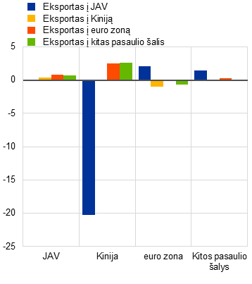 Pastabos: grafike parodyti dvišalės prekybos pokyčiai 2027 m. ketvirtąjį ketvirtį (nesvertiniai). Kinijos valiutos kursas iš dalies valdomas. Kitų pasaulio šalių rodiklis apskaičiuotas kaip paprastas eksporto nuokrypių nuo bazinio lygio vidurkis, vertinant pagal visus į ECB-Global modelį įtrauktus regionus, išskyrus JAV, Kiniją ir euro zoną.