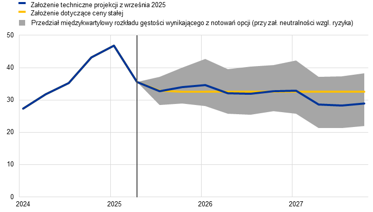 Uwagi: W niniejszej analizie wrażliwości stosuje się syntetyczny indeks cen energii, który obejmuje ceny terminowe ropy i gazu. 25. percentyl i 75. percentyl odnoszą się do rozkładu gęstości cen ropy i gazu wynikającego z notowań opcji (przy założeniu neutralności względem ryzyka) na 15 sierpnia 2025. Stałe ceny ropy i gazu również opierają się na wartościach z tego dnia. Skutki makroekonomiczne podaje się jako średnie wyników uzyskanych z różnych modeli makroekonomicznych stosowanych przez ekspertów EBC i Eurosystemu.