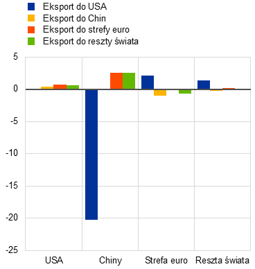 Uwagi: Wykres przedstawia (nieważone) zmiany w handlu dwustronnym w czwartym kwartale 2027. Chiny mają częściowo sterowany kurs walutowy. Wartości dla „reszty świata” obliczono jako średnią arytmetyczną odchylenia eksportu poszczególnych regionów od scenariusza bazowego w modelu ECB‑Global, z wyłączeniem Stanów Zjednoczonych, Chin i strefy euro.