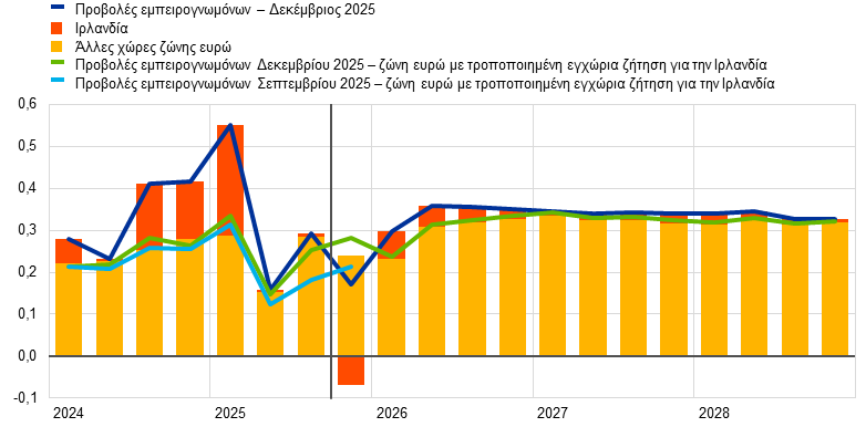 Πηγές: ΟΟΣΑ, Economic Outlook, 4 Δεκεμβρίου 2025· Προβλέψεις της Consensus Economics, 11 Δεκεμβρίου 2025 (τα στοιχεία για το 2027 και το 2028 προέρχονται από την έρευνα του Οκτωβρίου 2025)· Οικονομικές Προβλέψεις της Ευρωπαϊκής Επιτροπής, Φθινόπωρο 2025, 17 Νοεμβρίου 2025· Έρευνα της ΕΚΤ μεταξύ των Επαγγελματικών Φορέων Διενέργειας Προβλέψεων, 31 Οκτωβρίου 2025· ΔΝΤ, World Economic Outlook, 14 Οκτωβρίου 2025.
