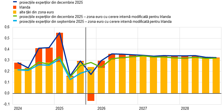 Sursa: OECD Economic Outlook, 4 decembrie 2025, Consensus Economics Forecasts, 11 decembrie 2025 (datele pentru 2027 și 2028 sunt preluate din sondajul realizat în luna octombrie 2025); Previziunile economice ale Comisiei Europene, toamna anului 2025, 17 noiembrie 2025; Sondajul BCE în rândul specialiștilor în prognoză, 31 octombrie 2025; și IMF World Economic Outlook, 14 octombrie 2025.