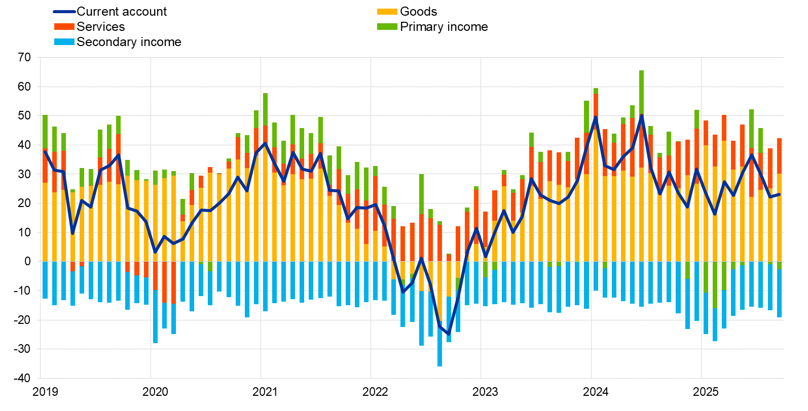 The current account of the euro area recorded a surplus of €23 billion in September 2025, an increase of €1 billion from the previous month (Chart 1 and Table 1). Surpluses were recorded for goods (€30 billion) and services (€12 billion). These were partly offset by deficits for secondary income (€17 billion) and primary income (€3 billion).
