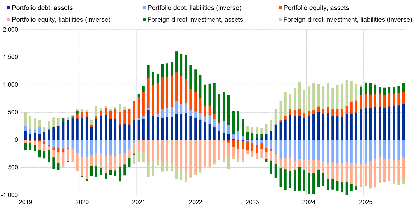 - In financial account, euro area residents’ net acquisitions of non-euro area portfolio investment securities totalled €868 billion and non-residents’ net acquisitions of euro area portfolio investment securities totalled €729 billion in the 12 months to September 2025