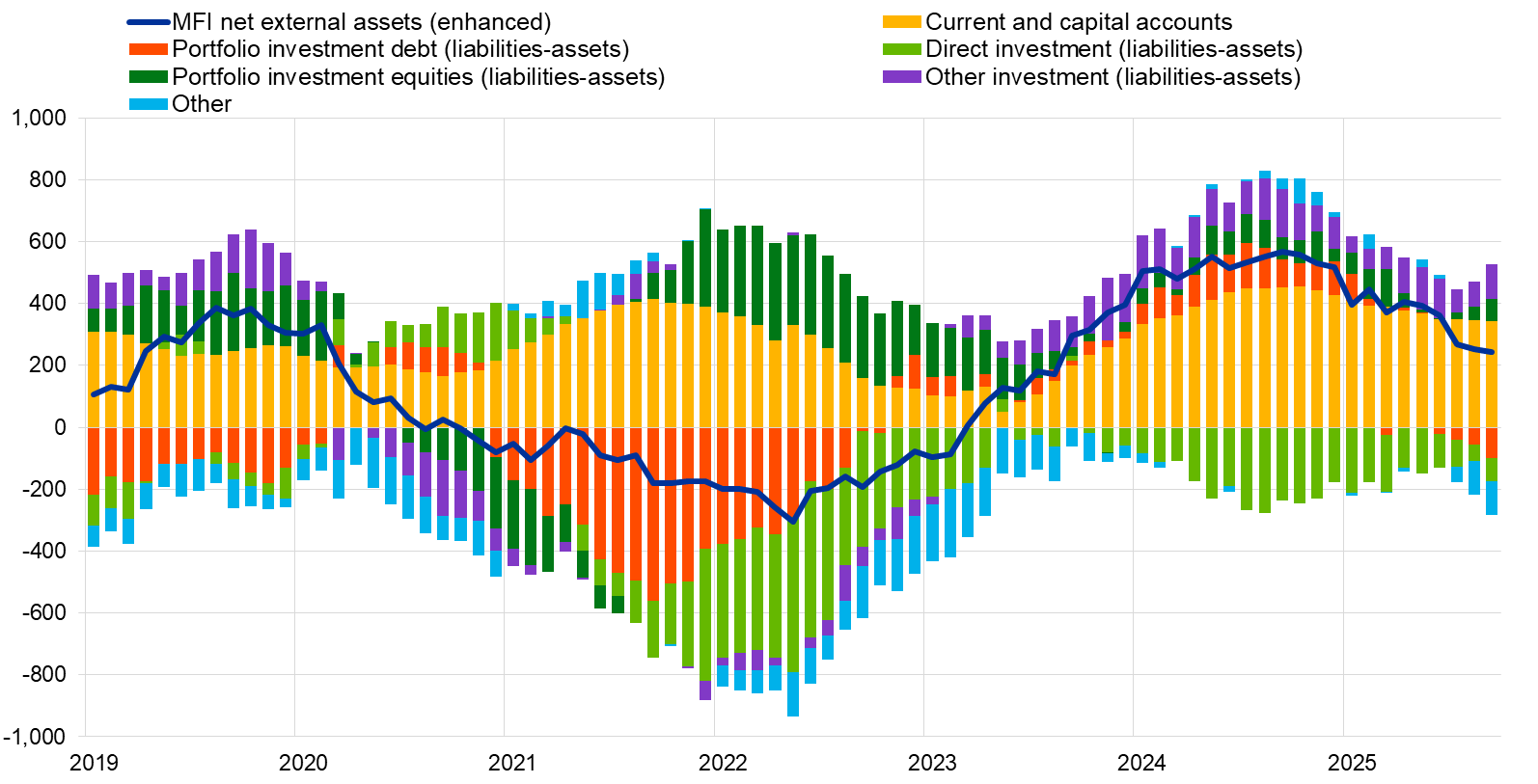 The monetary presentation of the balance of payments (Chart 3) shows that the net external assets (enhanced) of euro area MFIs increased by €244 billion in the 12 months to September 2025. This increase was driven by the current and capital accounts surplus and euro area non-MFIs’ net inflows in other investment and portfolio investment equity. These developments were partly offset by euro area non-MFIs’ net outflows in other flows, portfolio investment debt and direct investment.