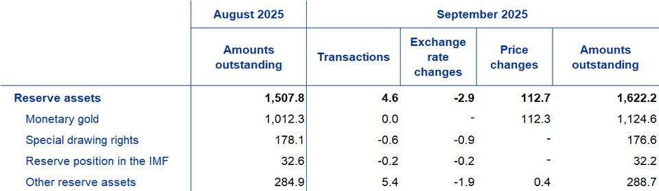 In September 2025 the Eurosystem’s stock of reserve assets increased to €1,622.2 billion up from €1,507.8 billion in the previous month (Table 3). This increase was largely driven by positive price changes (€112.7 billion), due to an increase in the price of gold, and, to a lesser extent, by net acquisitions of assets (€4.6 billion). These were partly offset by negative exchange rate changes (€2.9 billion).