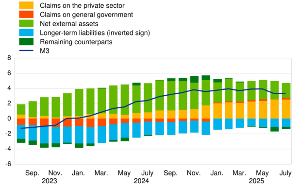The annual growth rate of M3 in July 2025, as a reflection of changes in the items on the monetary financial institution (MFI) consolidated balance sheet other than M3 (counterparts of M3), can be broken down as follows: claims on the private sector contributed 2.6 percentage points (as in the previous month), net external assets contributed 1.9 percentage points (down from 2.4 percentage points), claims on general government contributed 0.2 percentage points (up from 0.0 percentage points), longer-term liabilities contributed -1.1 percentage points (as in the previous month), and the remaining counterparts of M3 contributed -0.2 percentage points (up from -0.6 percentage points).