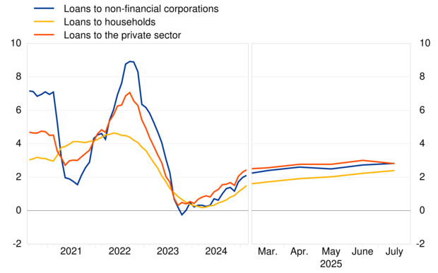 - Annual growth rate of adjusted loans to non-financial corporations stood at 2.8% in July, compared with 2.7% in June