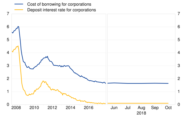 As regards new deposit agreements, the interest rate on deposits from corporations with an agreed maturity of up to one year stayed more or less constant at 0.07% in October 2018.