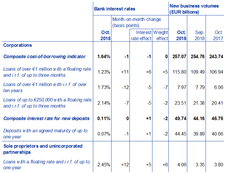 While the composite cost-of-borrowing indicator, which combines interest rates on all loans to corporations, remained broadly unchanged, October 2018 saw mixed developments in the cost of new borrowing by corporations both for small loans of up to €250,000 and for loans of over €1 million. For example, the interest rate on new loans of over €1 million with a floating rate and an initial rate fixation period of up to three months increased by 11 basis points from the previous month to 1.23%. This increase was due to the developments in one euro area country and it was driven by both interest rate and weight effects. The rate for new loans of the same size with an initial rate fixation period of over ten years decreased by 12 basis points to 1.73%. This decrease was due to the developments in two euro area countries and it was driven by both interest rate and weight effects. In the case of new loans of up to €250,000 with a floating rate and an initial rate fixation period of up to three months, the average rate charged decreased by 7 basis points to 2.14%.
