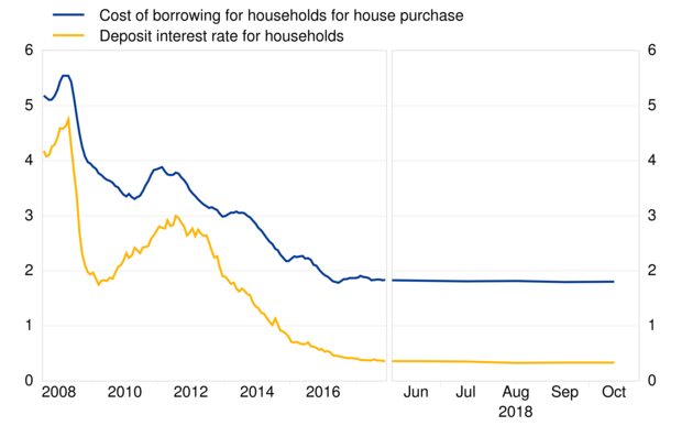 - The composite cost-of-borrowing indicators for new loans to corporations[1] and for new loans to households for house purchase[2] remained broadly unchanged in October 2018, at 1.64% and at 1.80%, respectively.