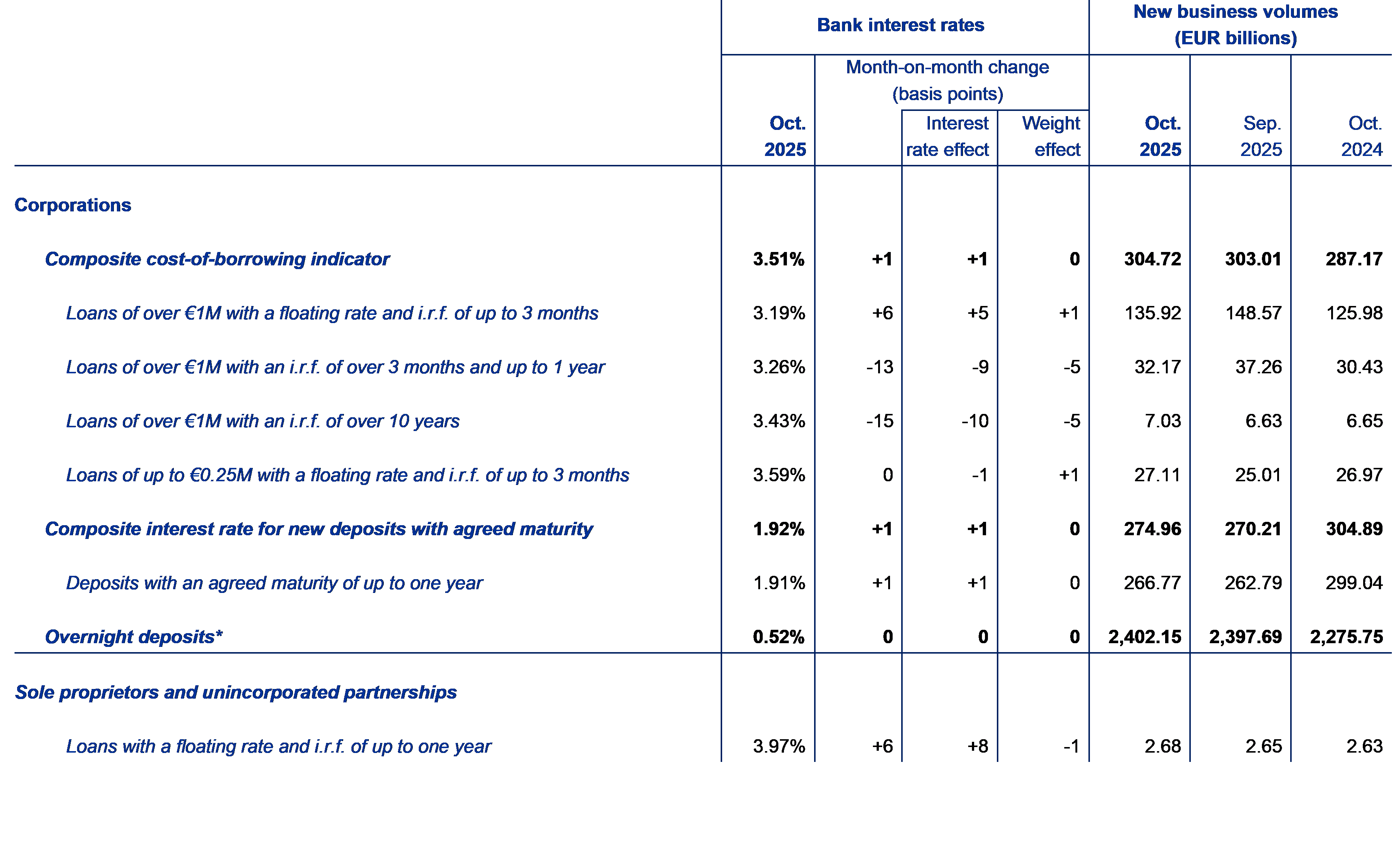- In addition to monthly euro area bank interest rate statistics for October 2025, this press release incorporates revisions to data for previous periods. Hyperlinks in the main body of the press release lead to data that may change with subsequent releases as a result of revisions. Unless otherwise indicated, these euro area statistics cover the EU Member States that had adopted the euro at the time to which the data relate.